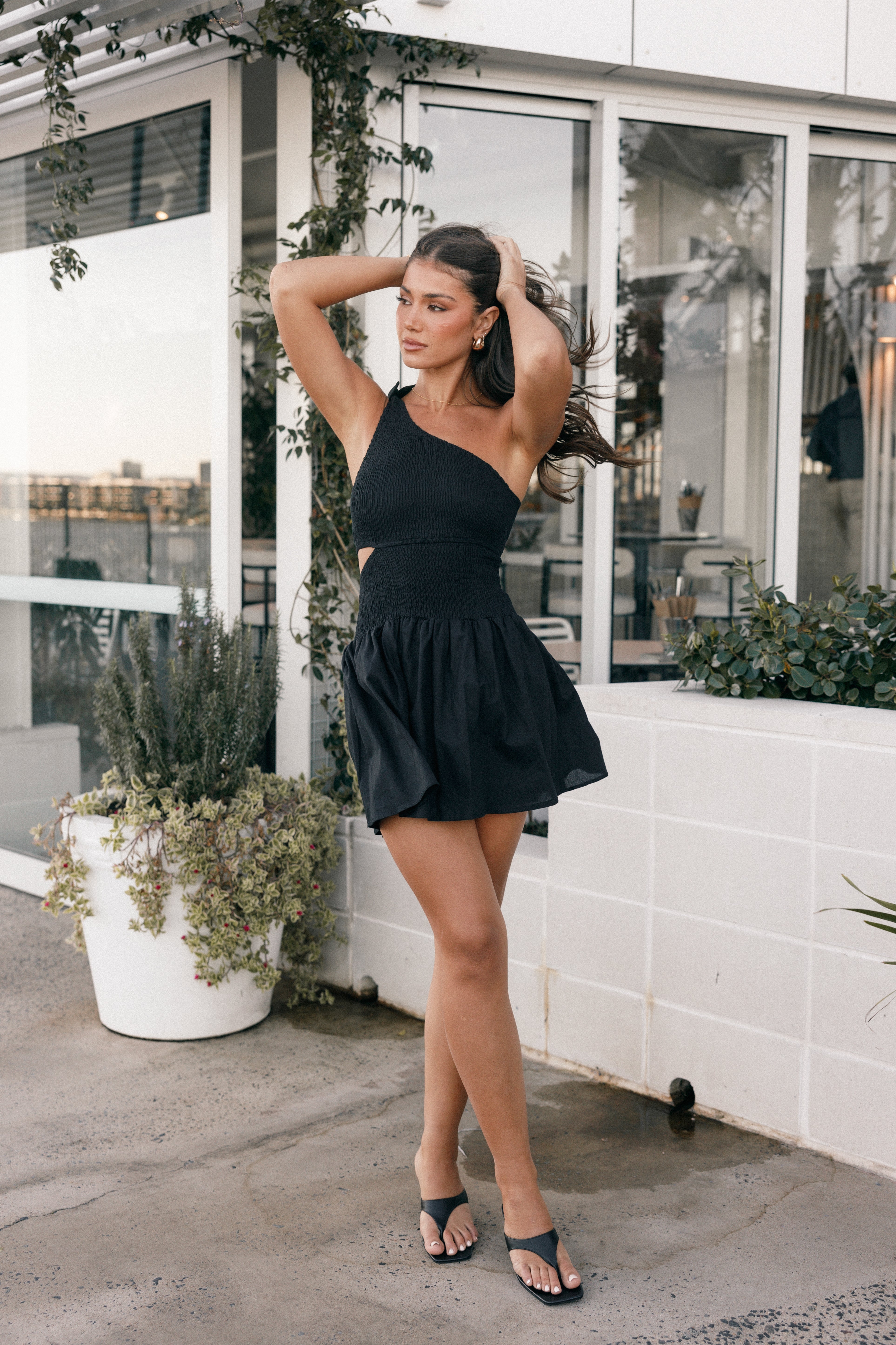 This one shoulder mini dress is the perfect way to show off your style. With its shirred bodice. asymmetric neckline and side cut out detail you will be sure to make a statement.