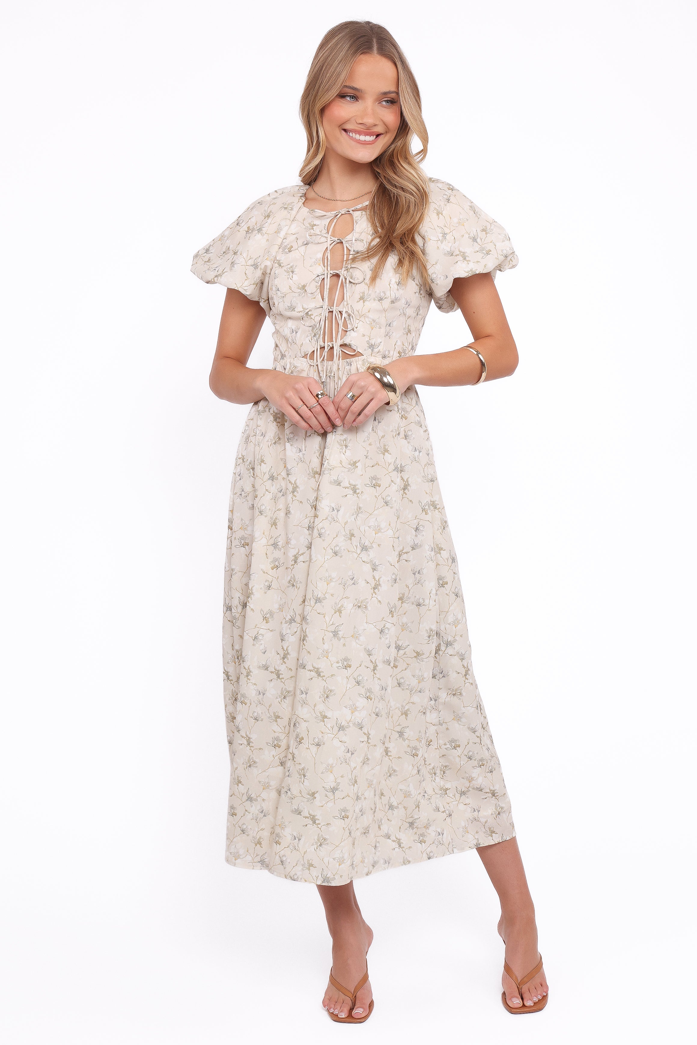 Elevate your wardrobe with the elegant charm of the Kathleen Maxi Dress in Light Beige and Green Floral. Designed with thoughtful . this maxi-length piece features a soft round neckline and short sleeves with elasticised cuffs. giving it a relaxed yet polished vibe.